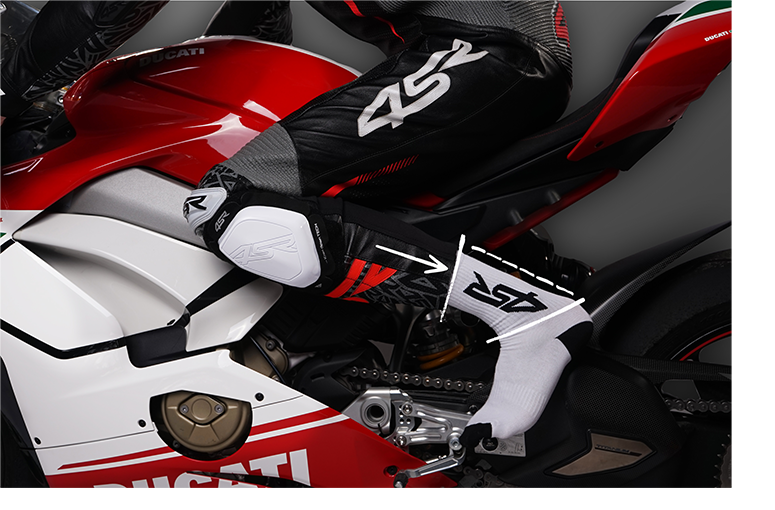 LEG LENGTH The motorcycle suit belongs in the boots, so the pant legs must be as short as possible, and the bottom hem should be as narrow as possible to not press in the motorcycle boots. The correct length of the pant legs can easily be checked in the riding position on the motorcycle |