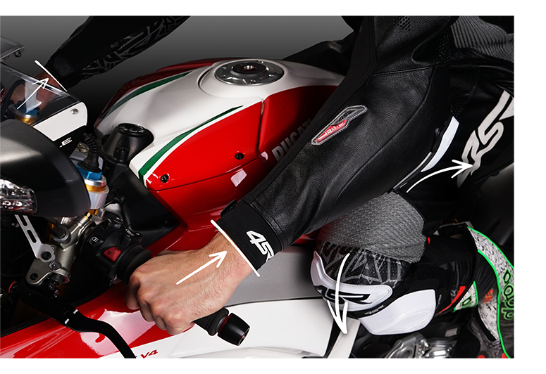 WRIST: SOFT, THIN, AND SHORT That's exactly how a wrist should correctly look on a sport suit. Therefore, the sleeve on 4SR suits is always shorter and ends with a thin cuff made of aramid stretch. Such a finish allows free wrist movement, and as you surely know, it's the wrist that controls the motorcycle |