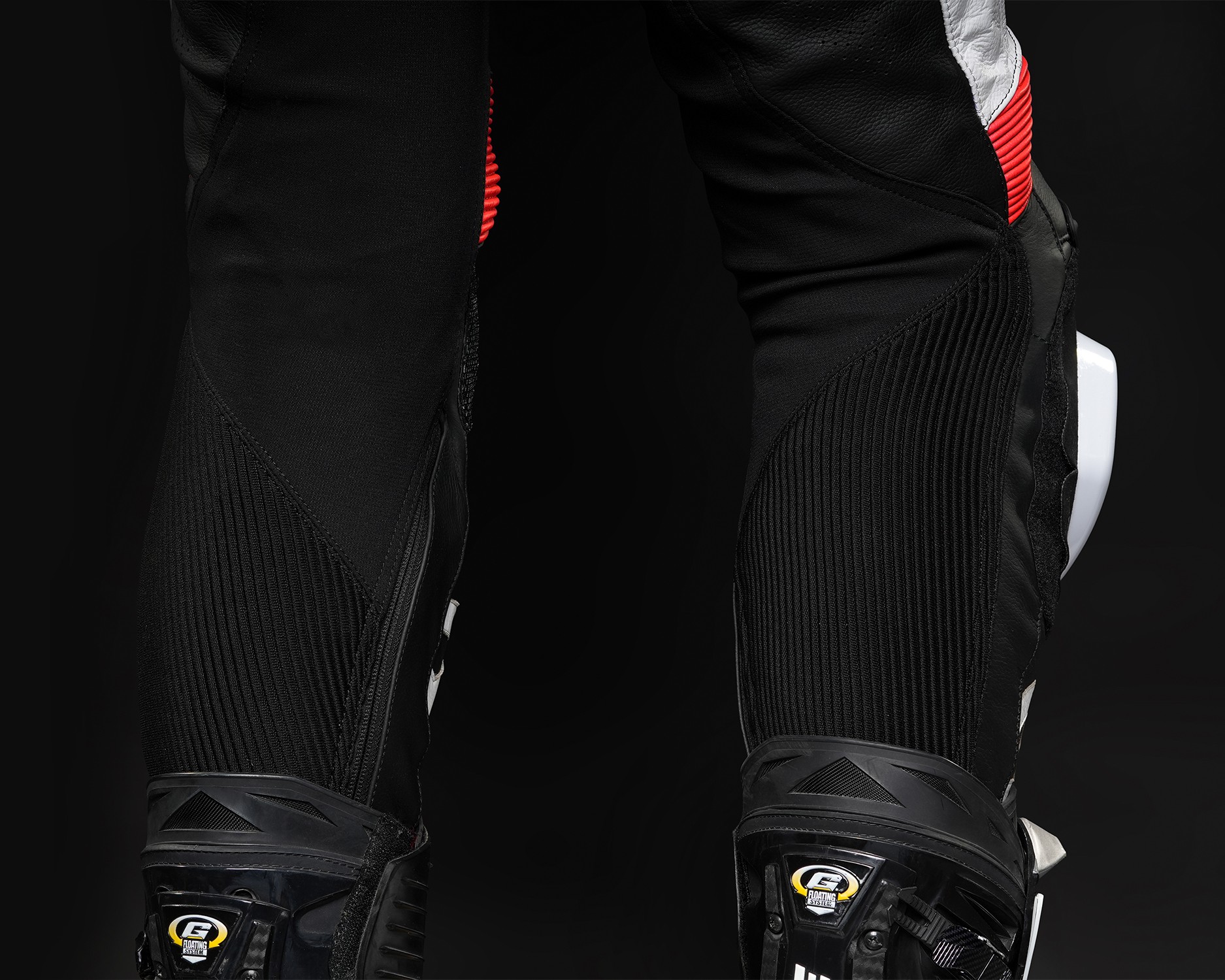 - flexible leather panels above the knees and on the lower back for better mobility on the motorcycle