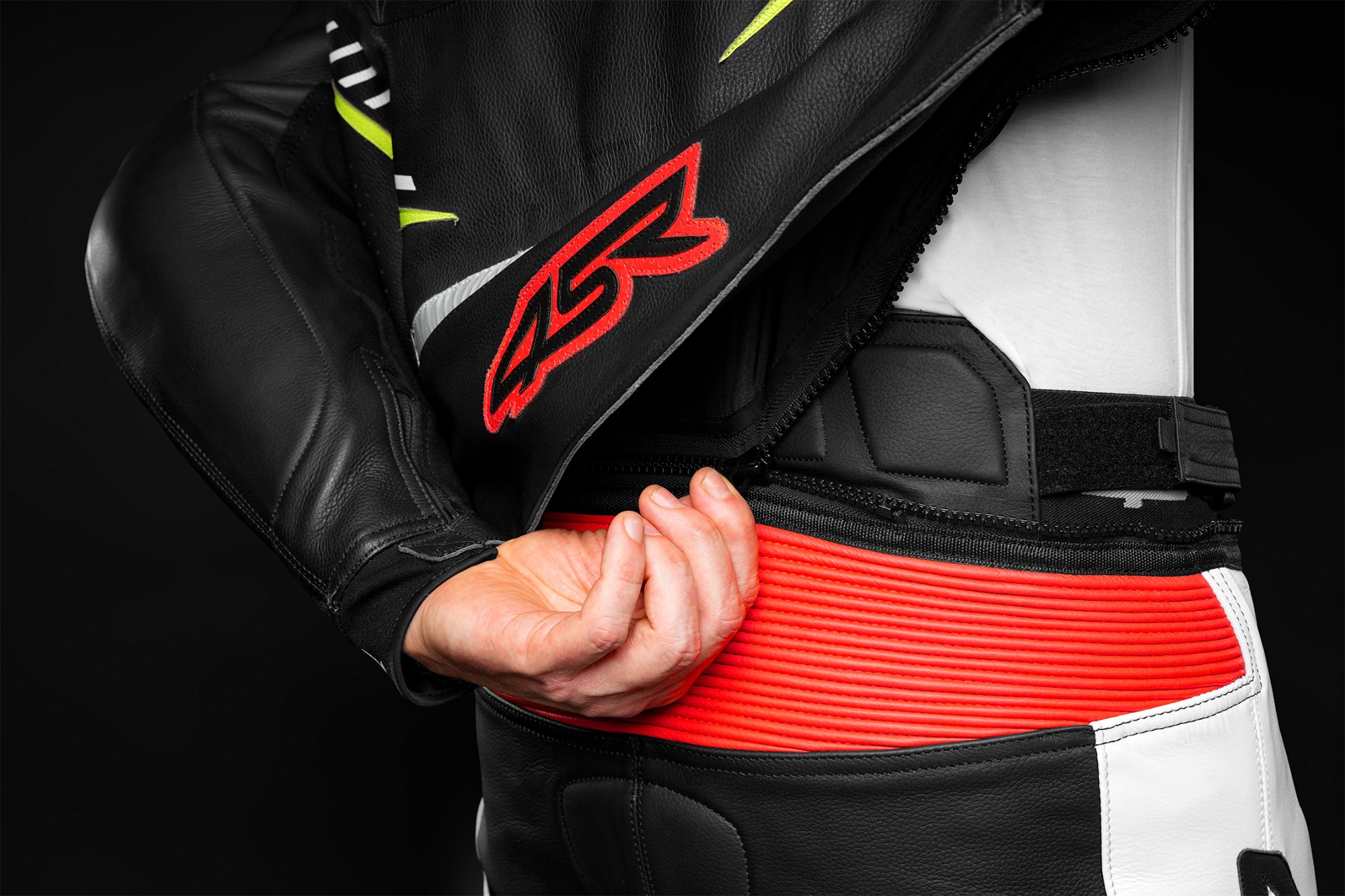 - short and long connection zippers in the waist allow attachment to a leather jacket or the upper part of a 4SR two‑piece suit